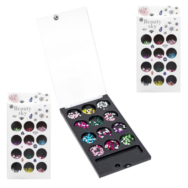 Набір для декорування нігтів складається з "страз" 12ти різних кольорів в пластмасовому футлярі. Розмір упаковки 13*7,5*0,8см