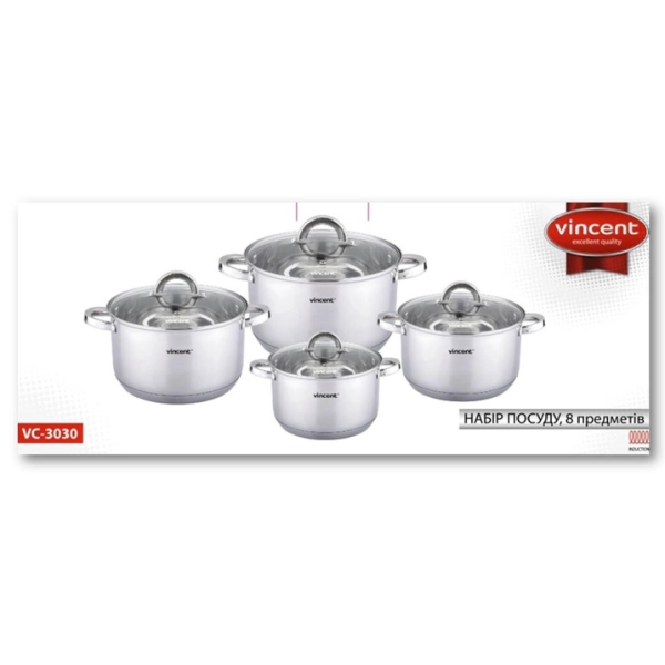 Набір посуду Vincent VC-3030 виготовлений із корозійностійкої сталі, головне якість якої не окислюватися і не деформуватися від зовнішніх впливів. Клепочное кріплення ручок, вважається міцним і менше піддаються нагріванню. Капсульне дно з хорошою теплопровідністю, скорочує час нагрівання і зберігає їжу від пригорання. Каструлі з набору Vincent VC-3030 покриті антикорозійним дзеркальною поліровкою і мають всі необхідні показники для комфортного приготування перших і других страв.